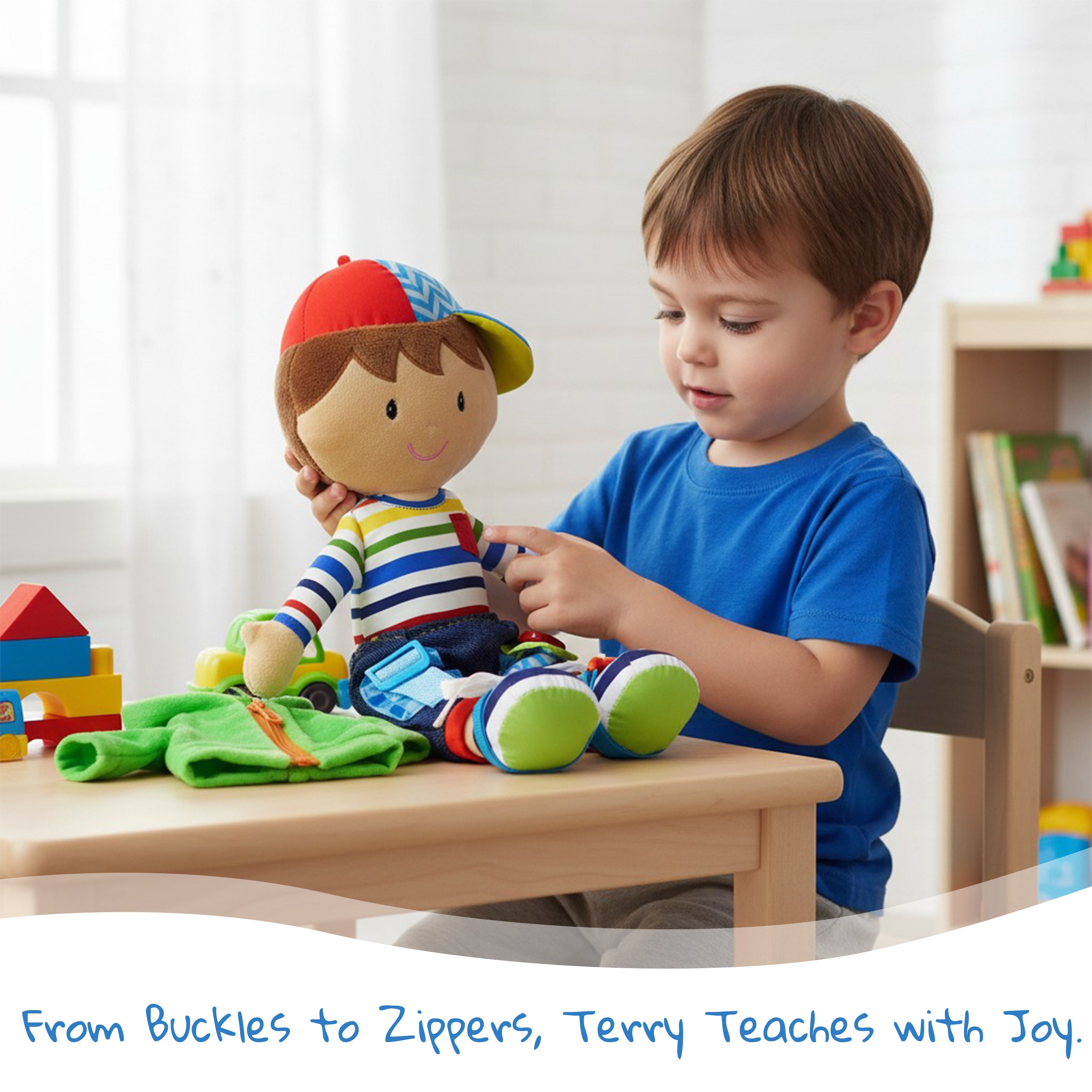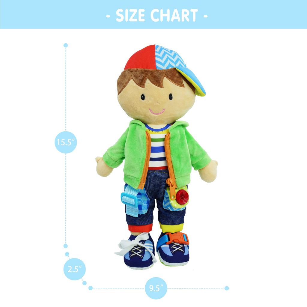 Dressy Friends Terry is an educational and enjoyable doll that offers six main activities for children to practice skills like snapping, hooking, fastening, buckling, zipping, and looping. Inspired by the Montessori approach to learning, Terry promotes natural learning by allowing toddlers to touch and interact with the materials, helping them develop sensory and motor skills. Kids can have fun while acquiring valuable skills with Terry.