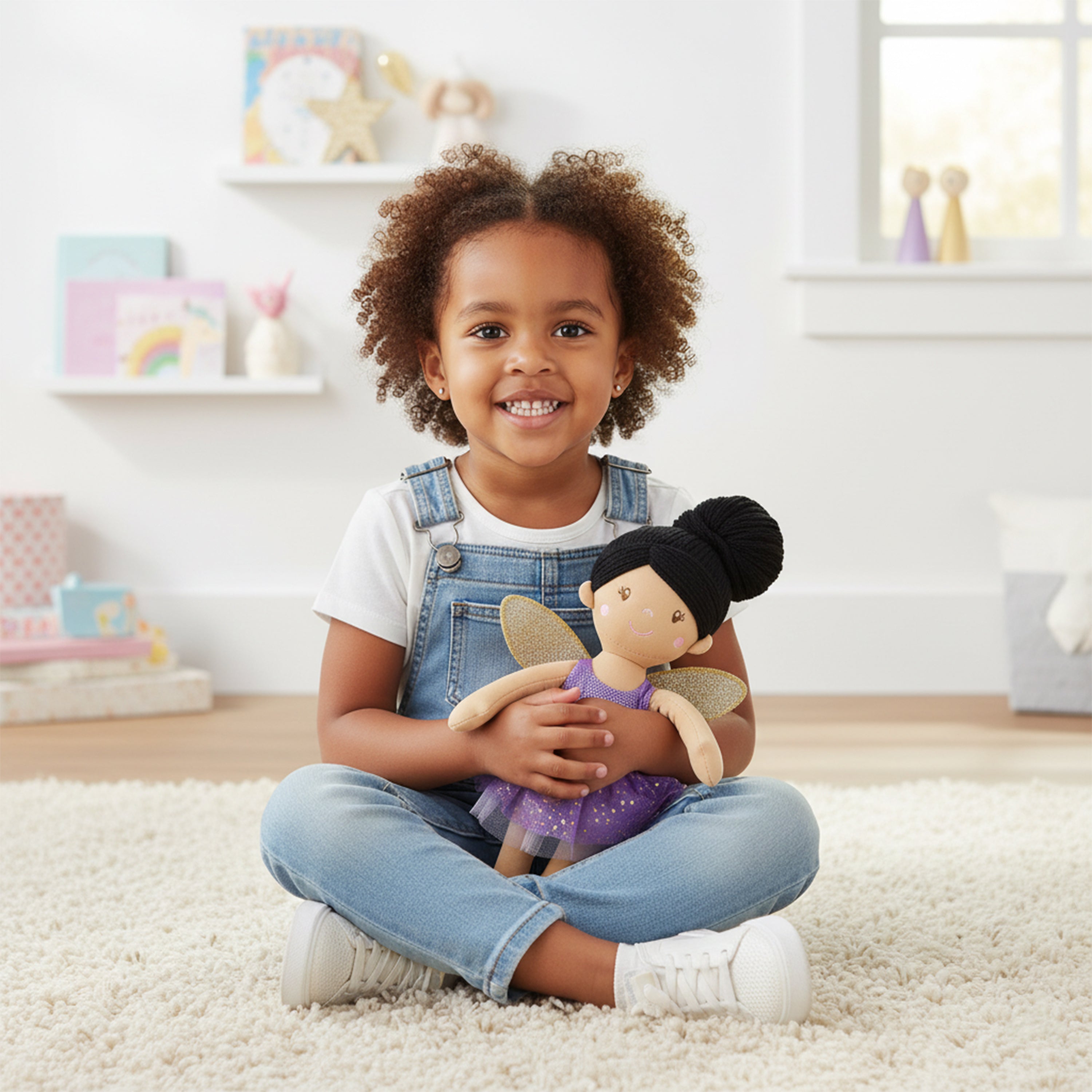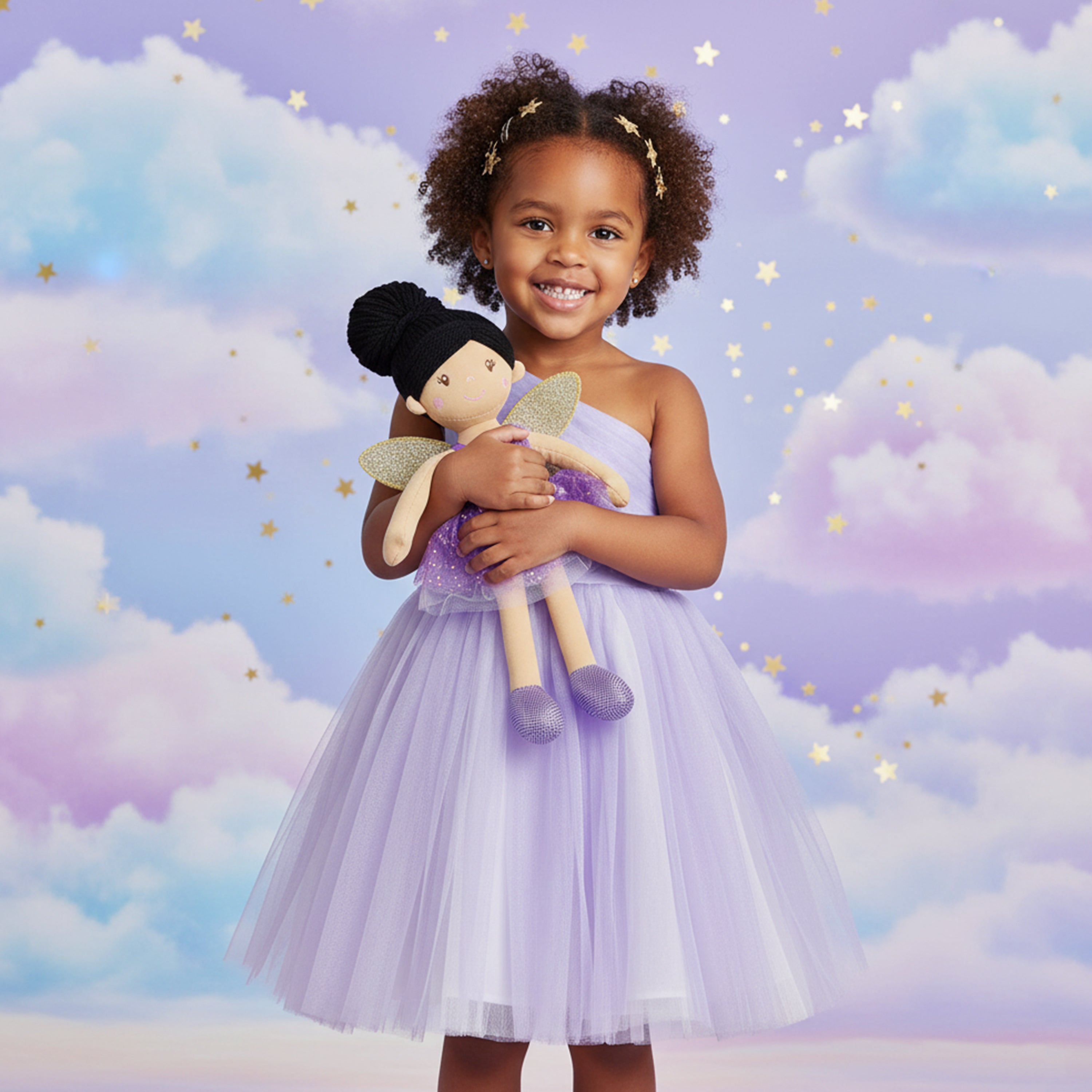Meet Violet, a sweet fairy from the Enchanted June Garden, enjoys using her magical powers to bring hope and love to children. Violet has gold wings and loves to wear purple tulle dress. Featuring embroidered cute eyes and a sweet smiley face, Violet is ready for a hug. Made of soft plush, Violet is perfect for role-playing and developing early caregiving skills. Kids will be rewarded with good luck and fortunes in the presence of this charming fairy.