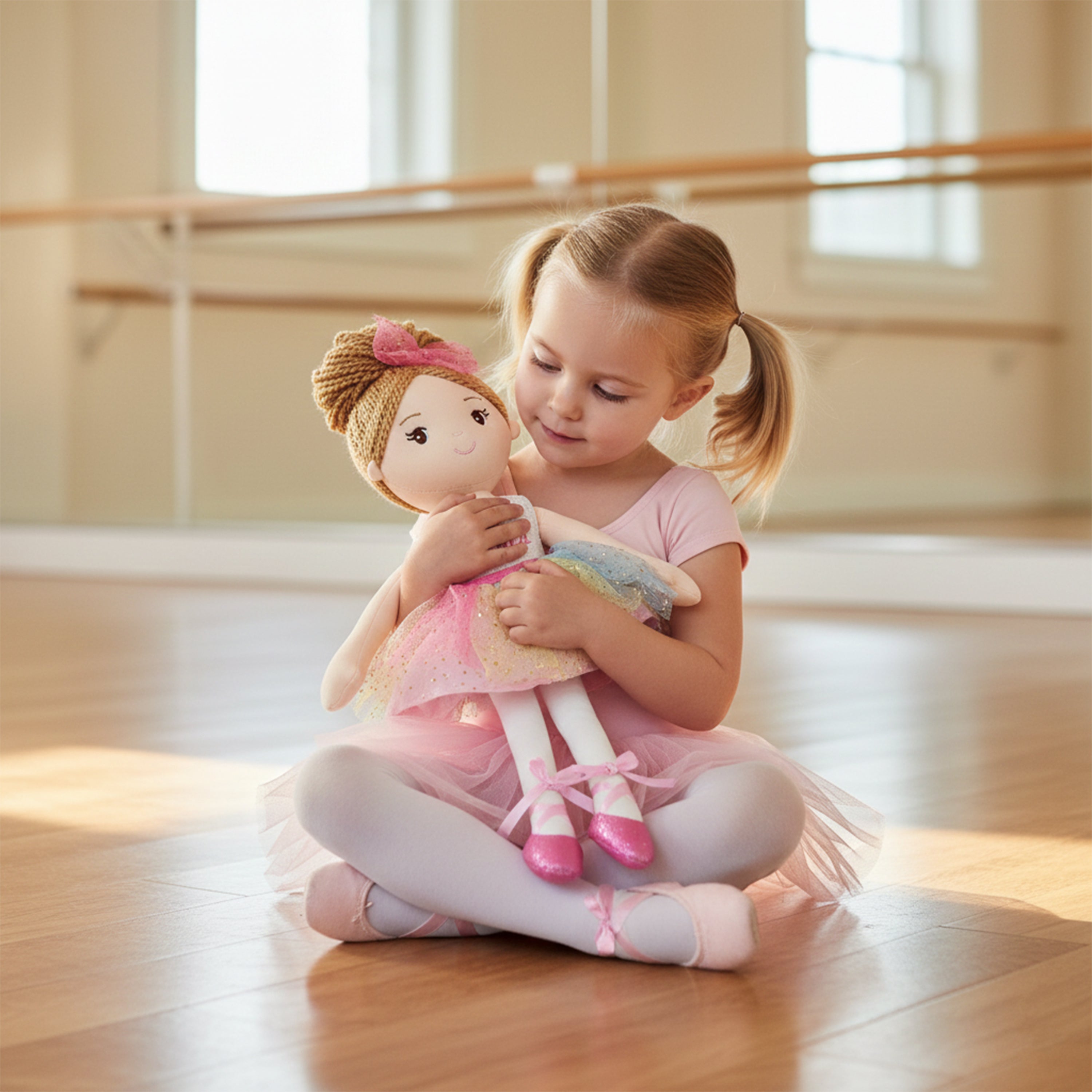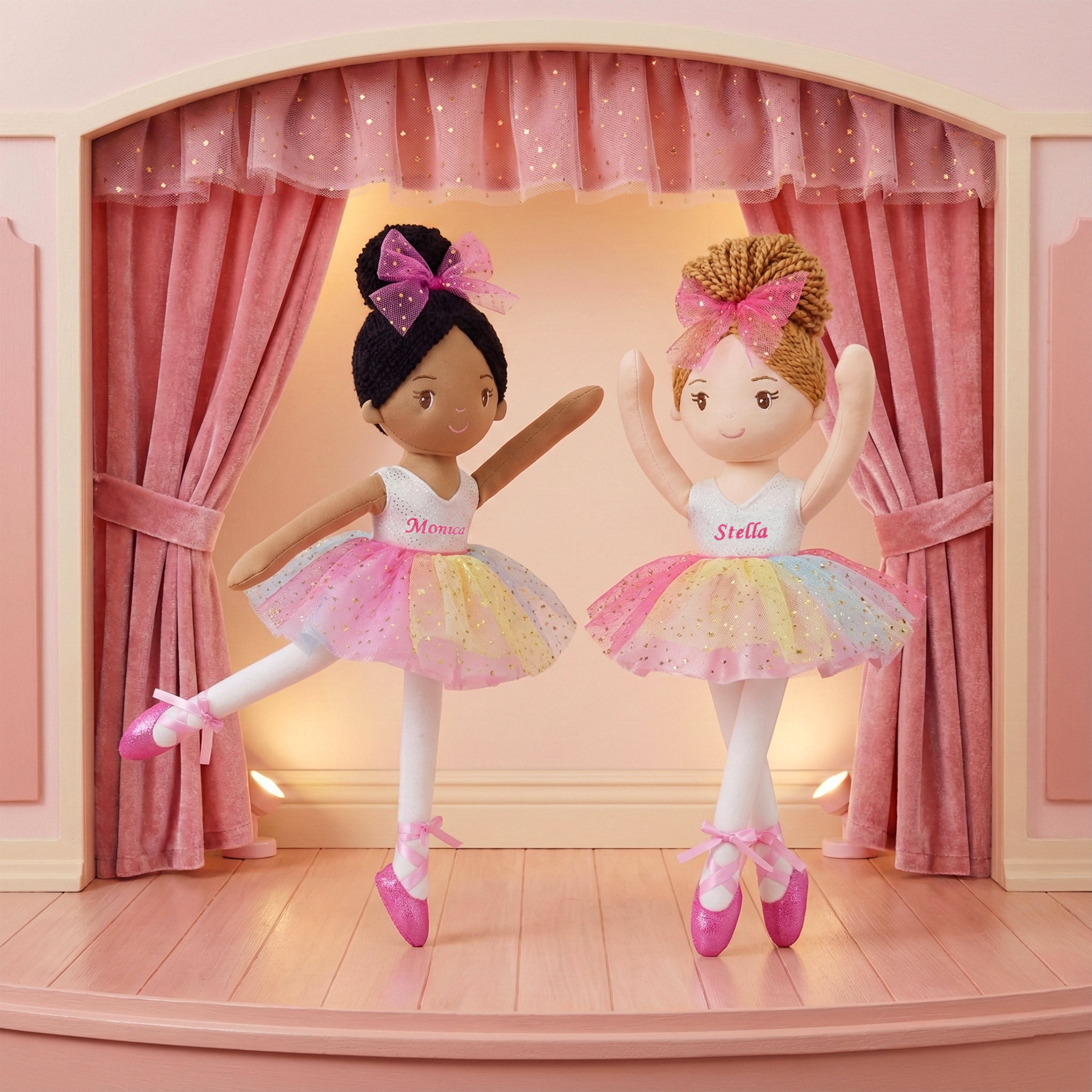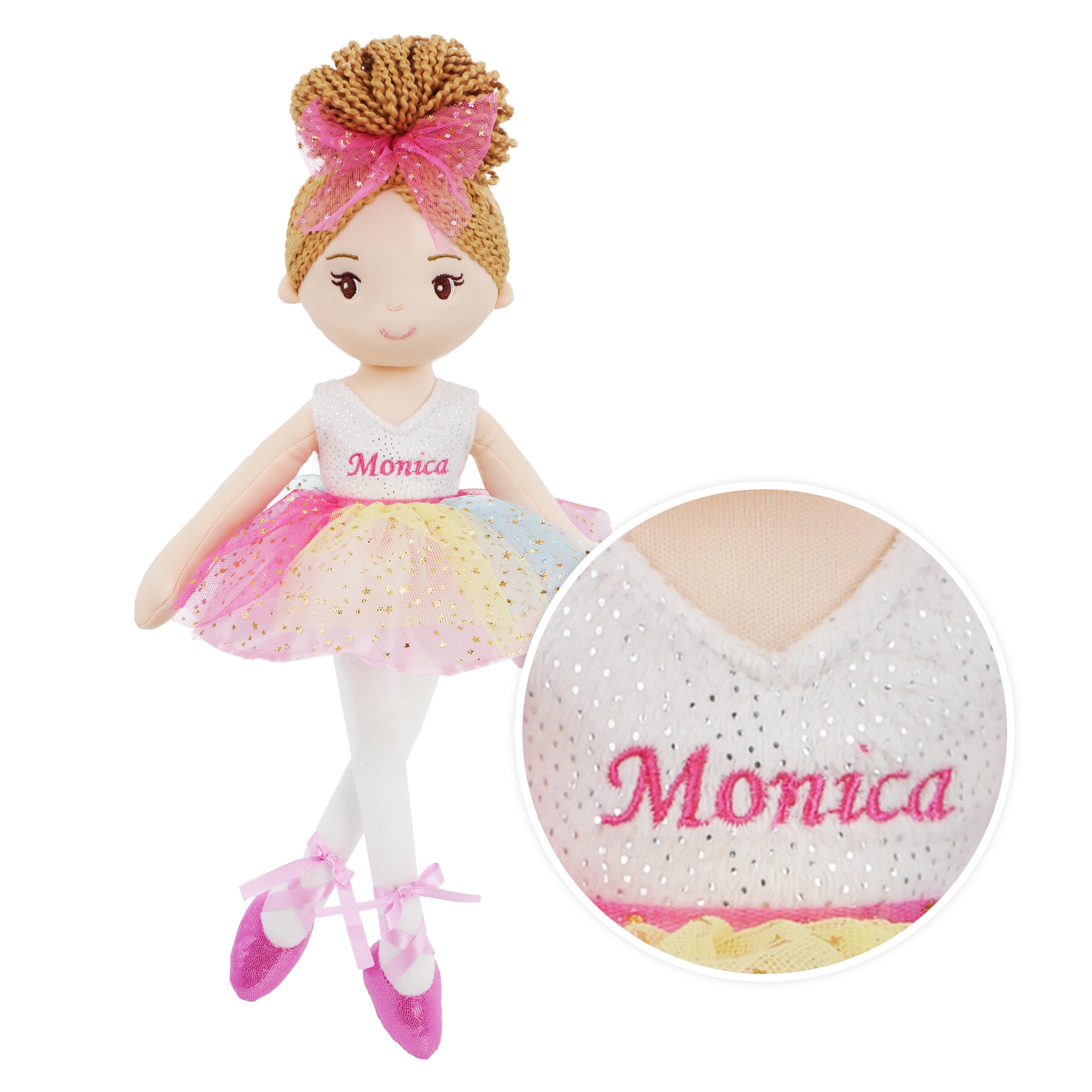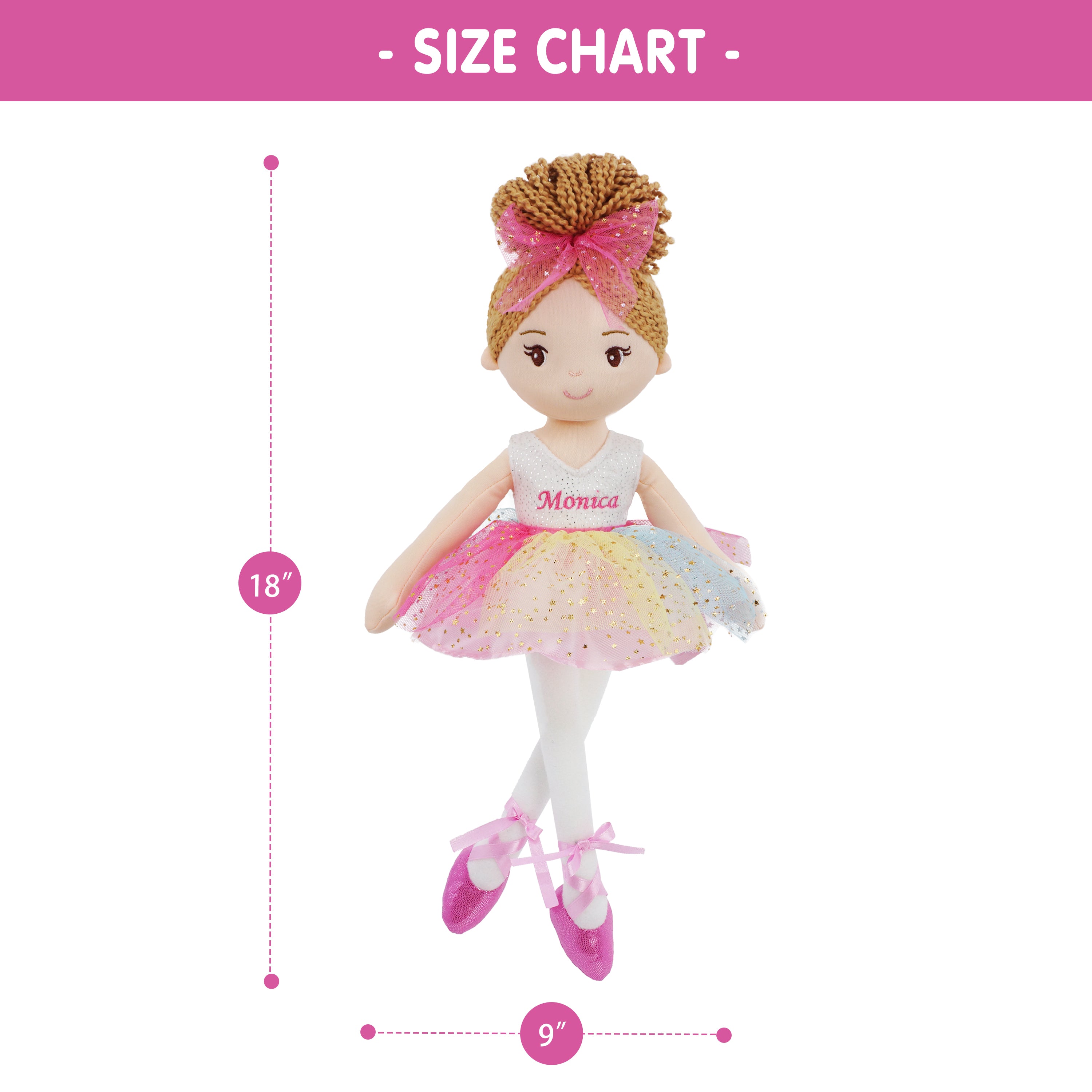 Monica is a stunning ballerina doll with brown yarn hair and a shimmery rainbow-colored tulle tutu dress. Her embroidered facial features and sweet smile add to her charm. Monica's pink ballet shoes are tied up with smooth satin ribbon, matching her dress perfectly. She is handmade with premium fabrics and stuffed with high-quality soft cotton, making her perfect for hugging and cuddling. As a valuable tool for kids to enhance their social skills and emotional abilities, ballerina doll Monica makes a great dance recital gift for toddler girls.