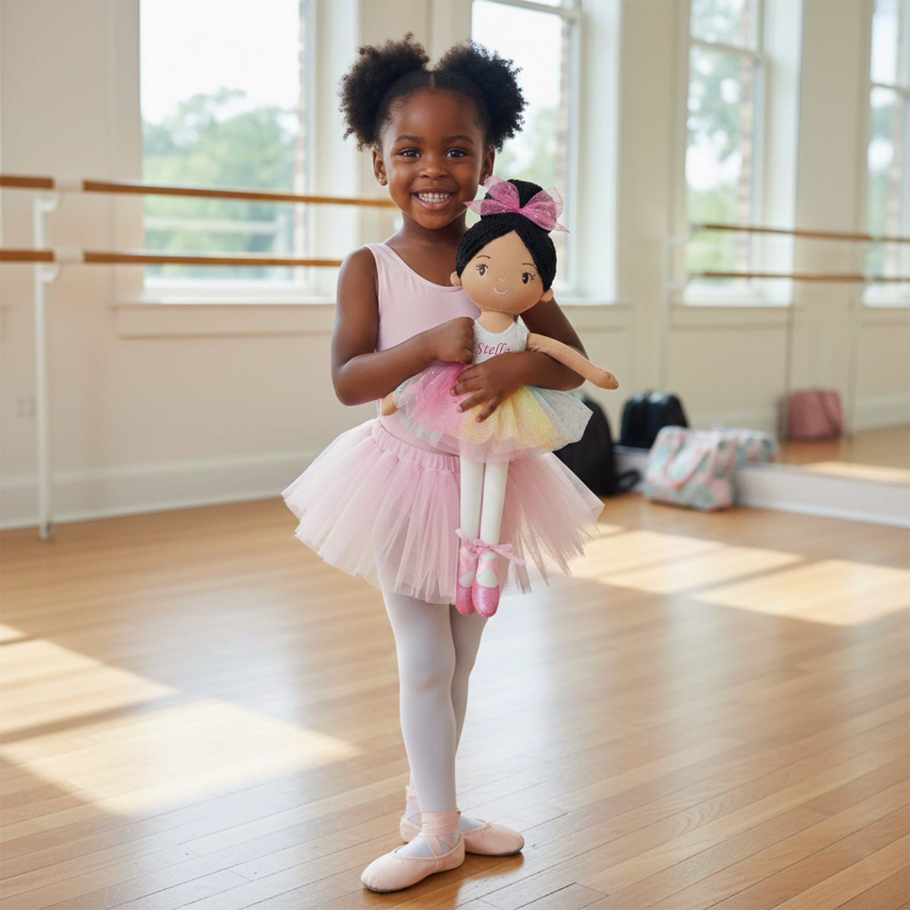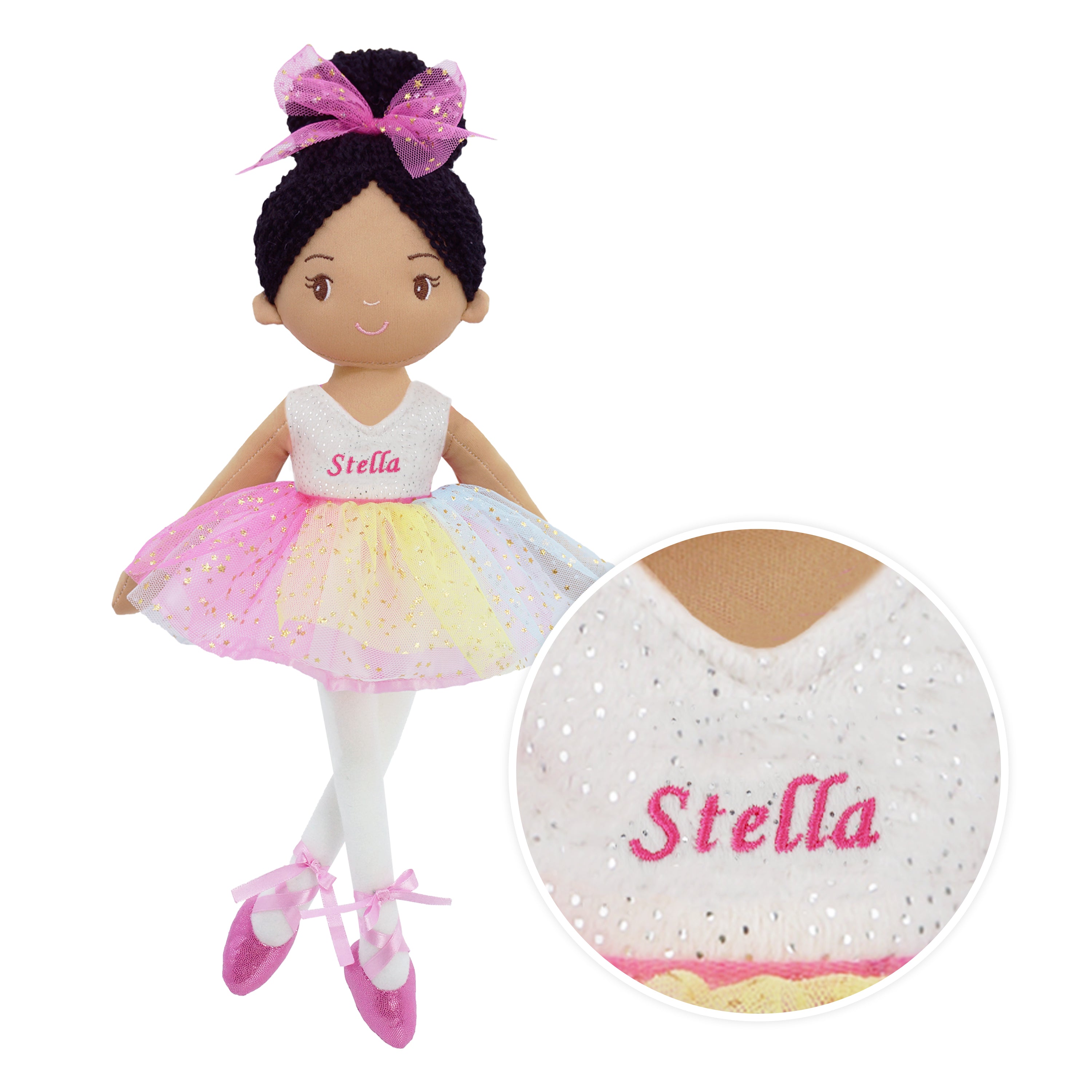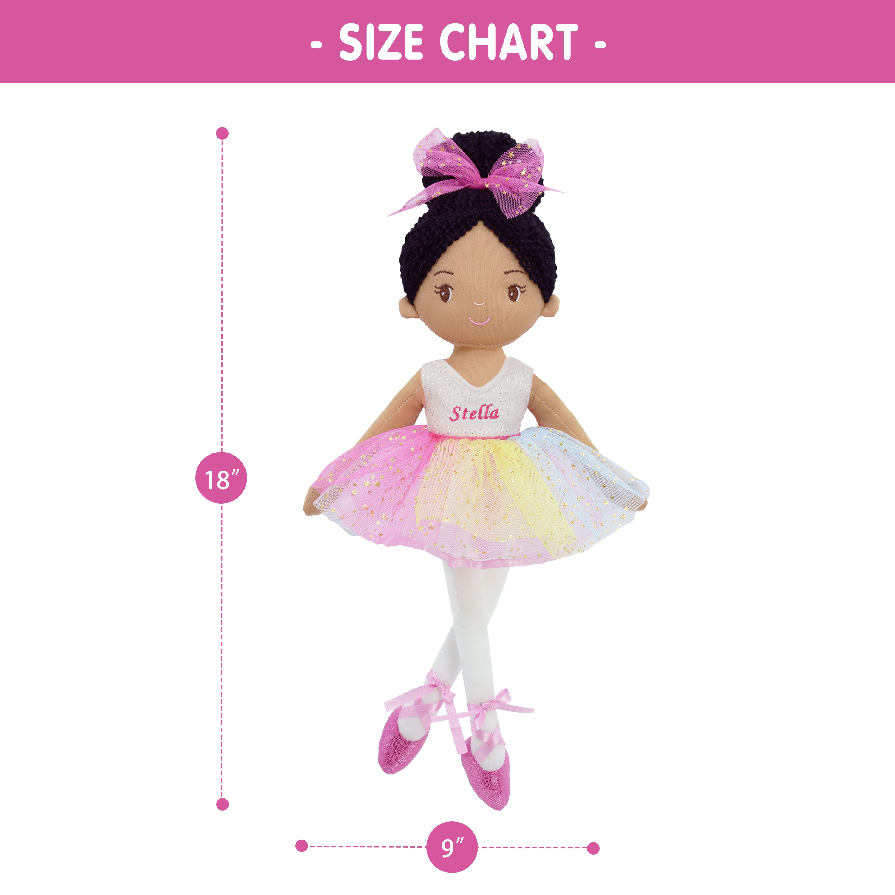 Stella is a stunning ballerina doll with black yarn hair and a shimmery rainbow-colored tulle tutu dress, making her the perfect dance recital gift for toddler girls. With her embroidered facial details and sweet smile, Stella is sure to capture the hearts of young dancers. Her pink ballet shoes are tied up with smooth satin ribbon, which perfectly complements her dress. Handmade with premium fabrics and stuffed with high-quality soft cotton, Stella is as huggable as she is beautiful. As a valuable tool for kids to enhance their social skills and emotional abilities, ballerina doll Stella is an excellent choice for parents looking to give their children a special gift.