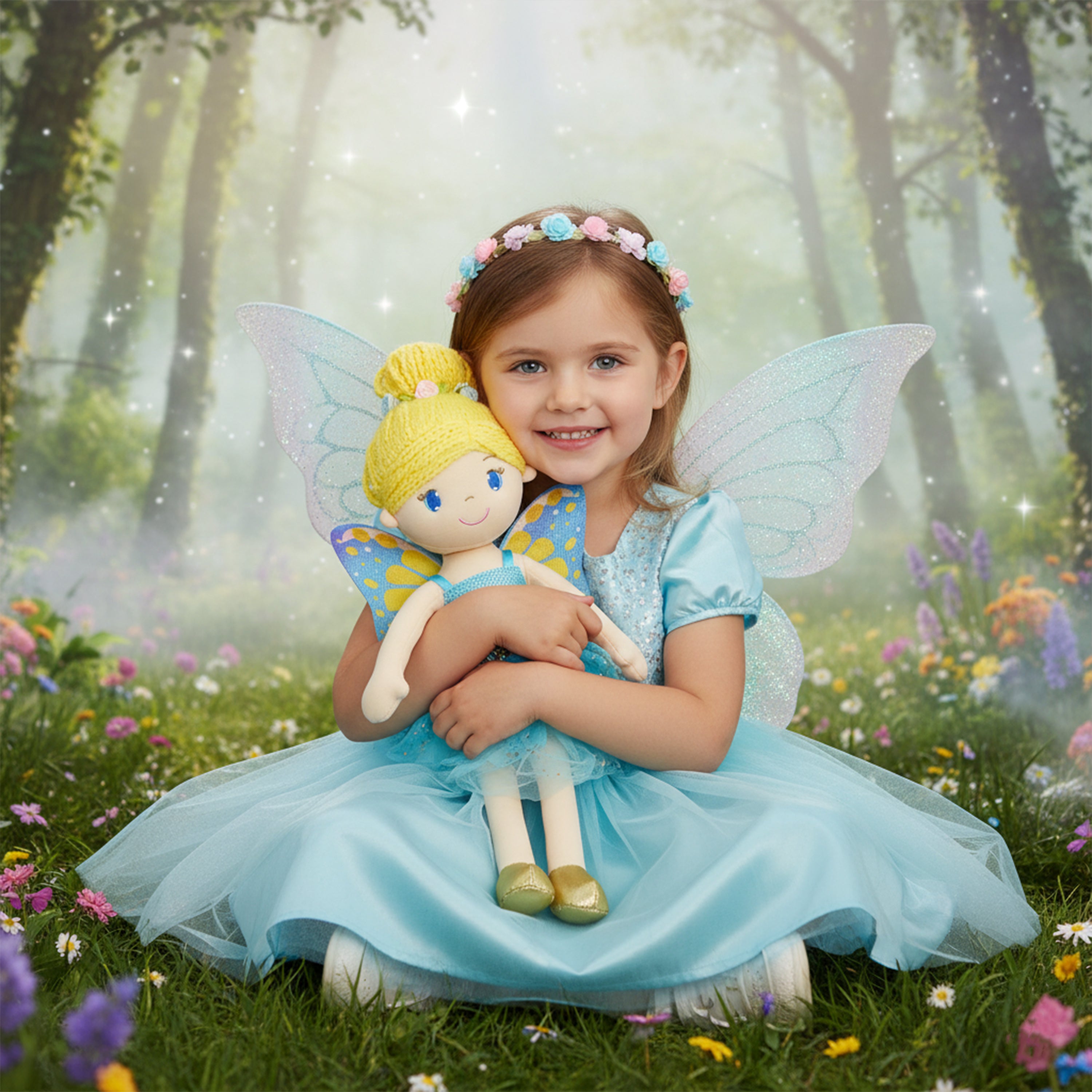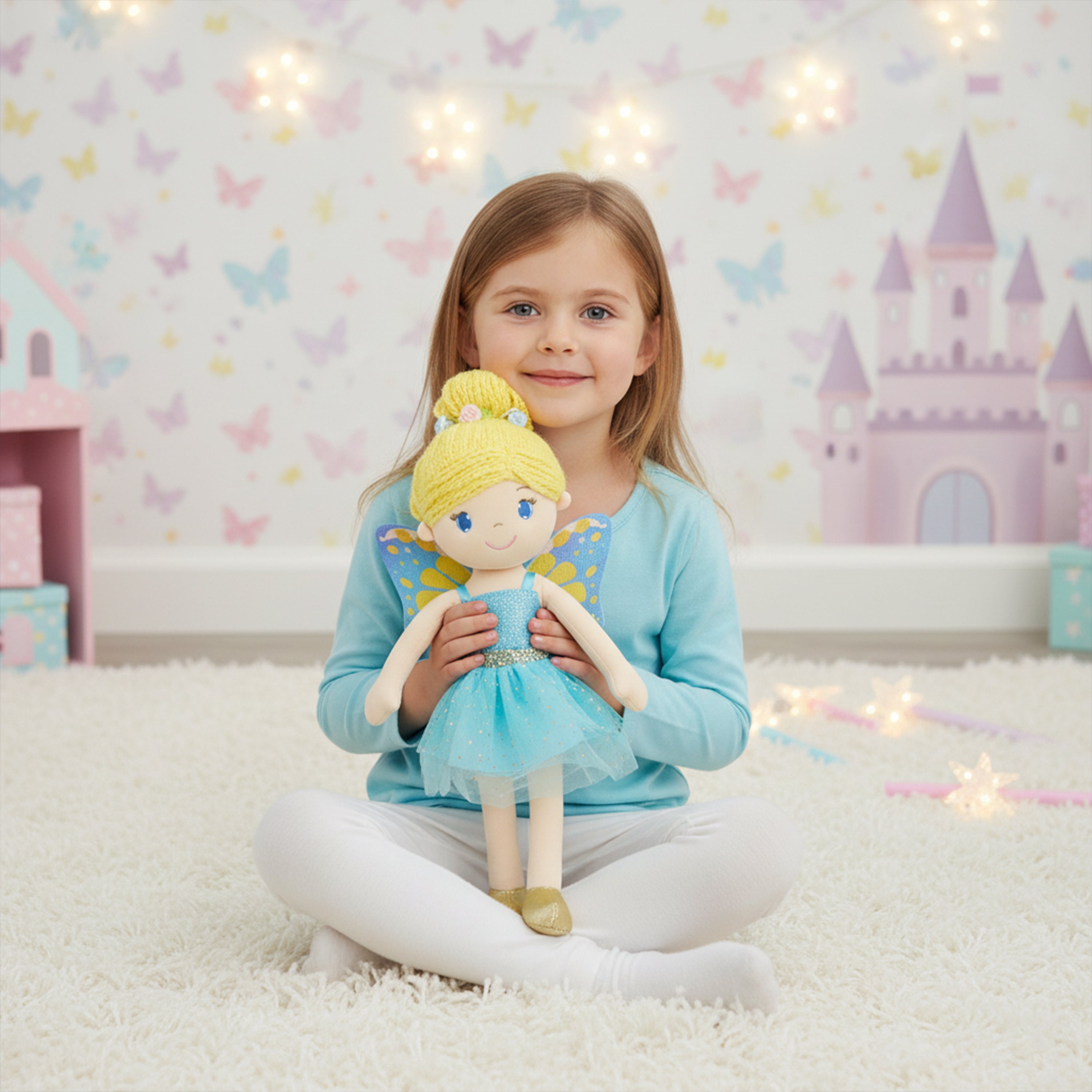 Meet Fayetta, a friendly fairy from the Enchanted June Garden who loves spreading peace and love to children through her magical powers. With her beautiful blue wings and matching tulle dress, Fayetta is a delightful sight to behold. Featuring adorable embroidered eyes and a sweet smile, she is always ready for a hug. Made of soft plush material, Fayetta is perfect for imaginative play and helps develop early caregiving skills in children. In the presence of this charming fairy, kids are sure to feel rewarded with good luck and positive vibes.