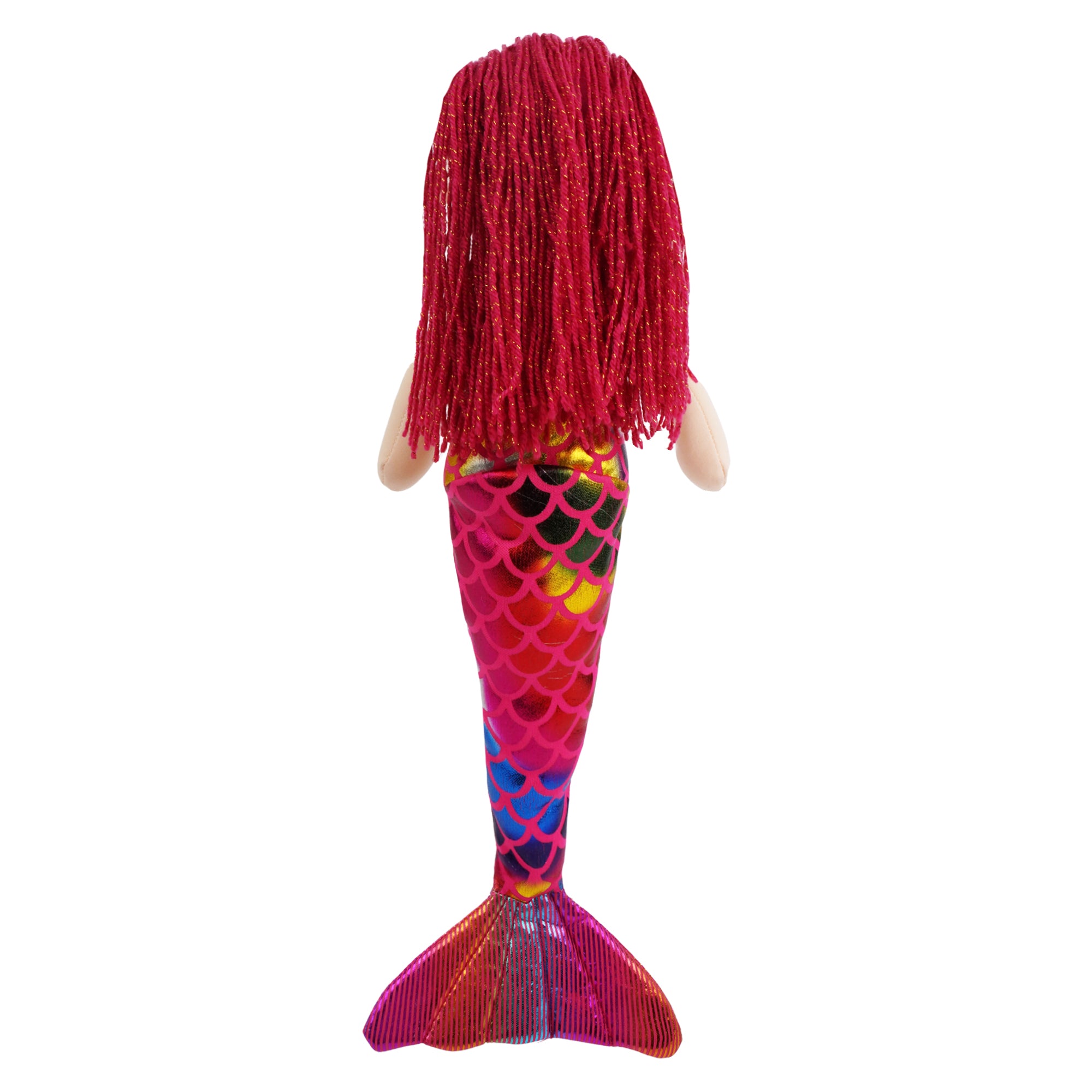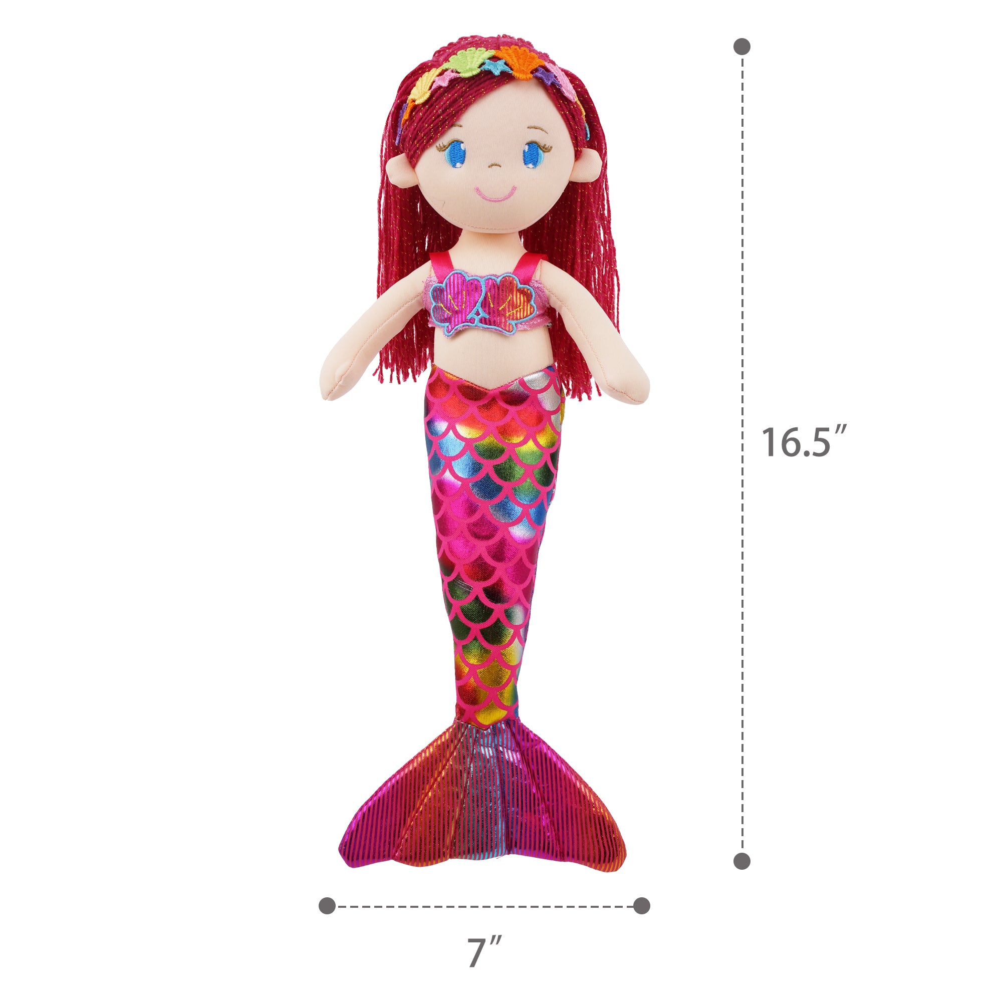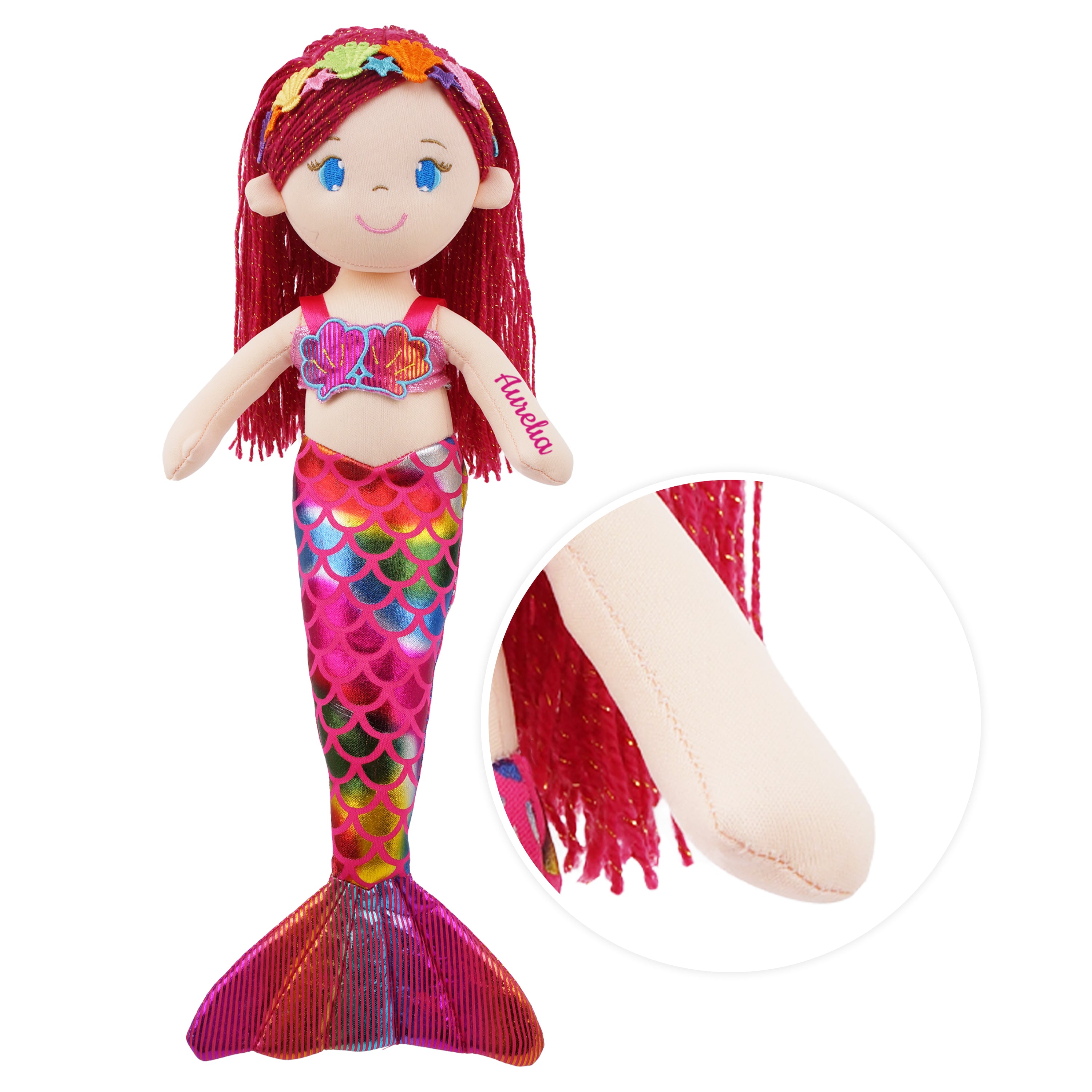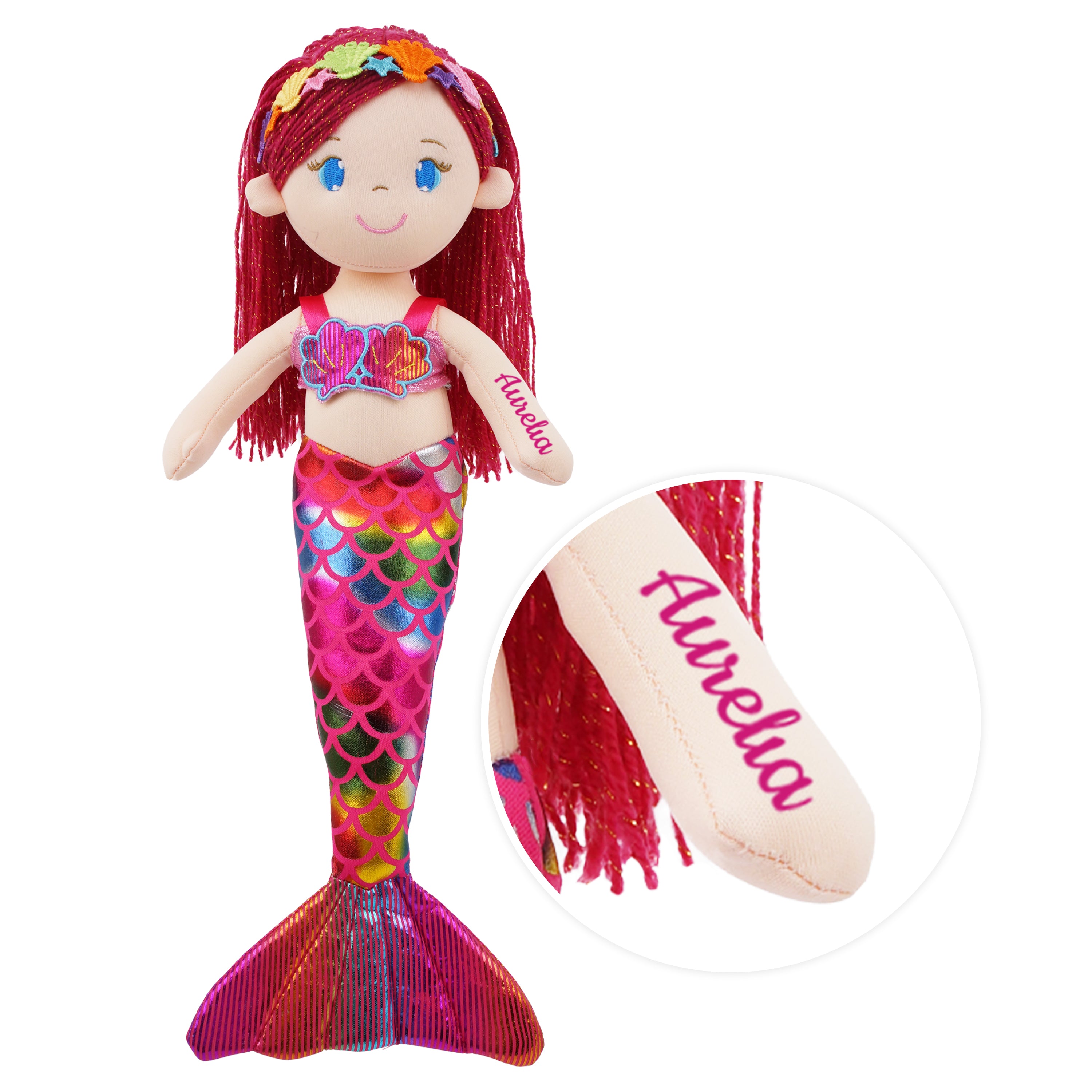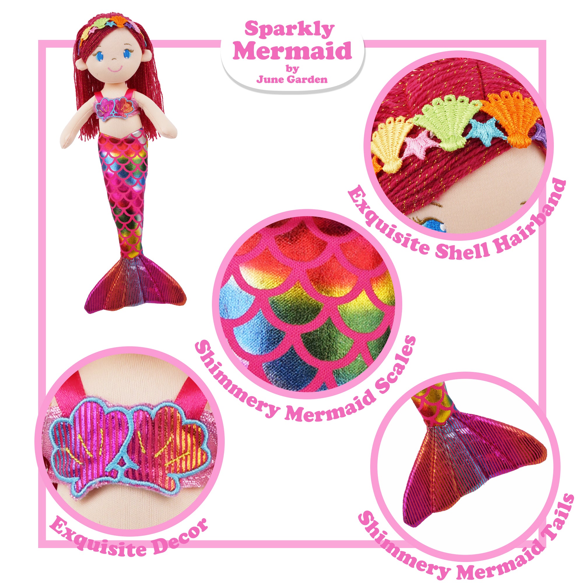 Introducing Aurelia, the stunning 16.5" mermaid doll from June Garden, designed to delight with her intricate embroidered facial features, big blue eyes, and friendly smile. She stands out with a cranberry color theme, including a vibrant hairband adorned with shell and star shapes and soft yarn hair enriched with gold strands for a magical touch. Aurelia's shimmery shell bodice and gradient sparkle tail invite adventurous play and storytelling. Crafted for comfort, she's perfectly cuddle-sized, safe for all ages, and destined to become a treasured companion. An enchanting gift for toddler girls, Aurelia is a joyous celebration of the sea's wonders, perfect for any occasion.