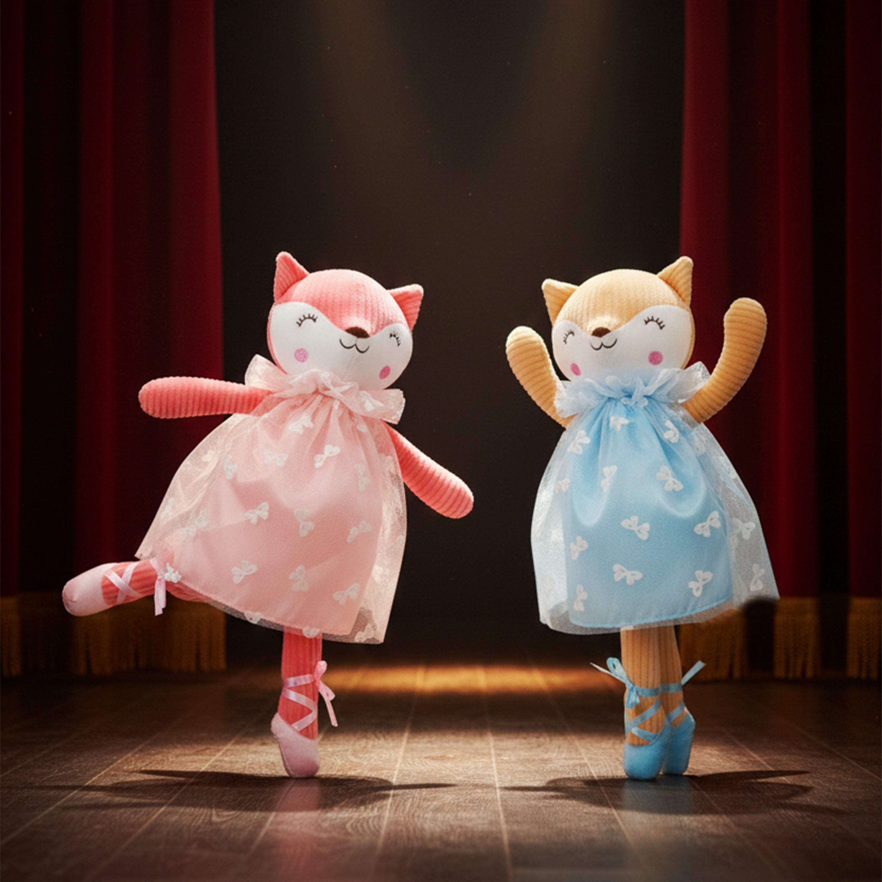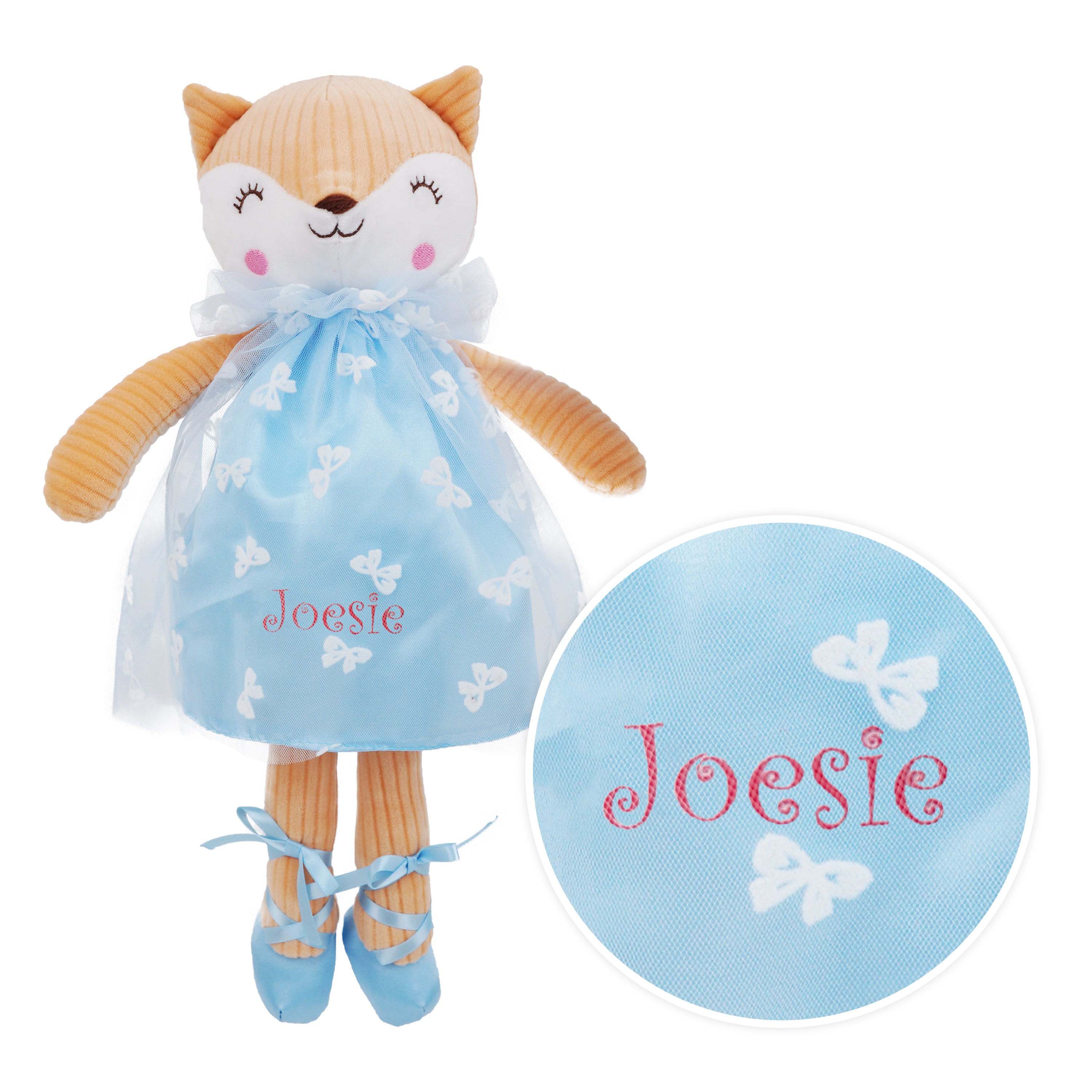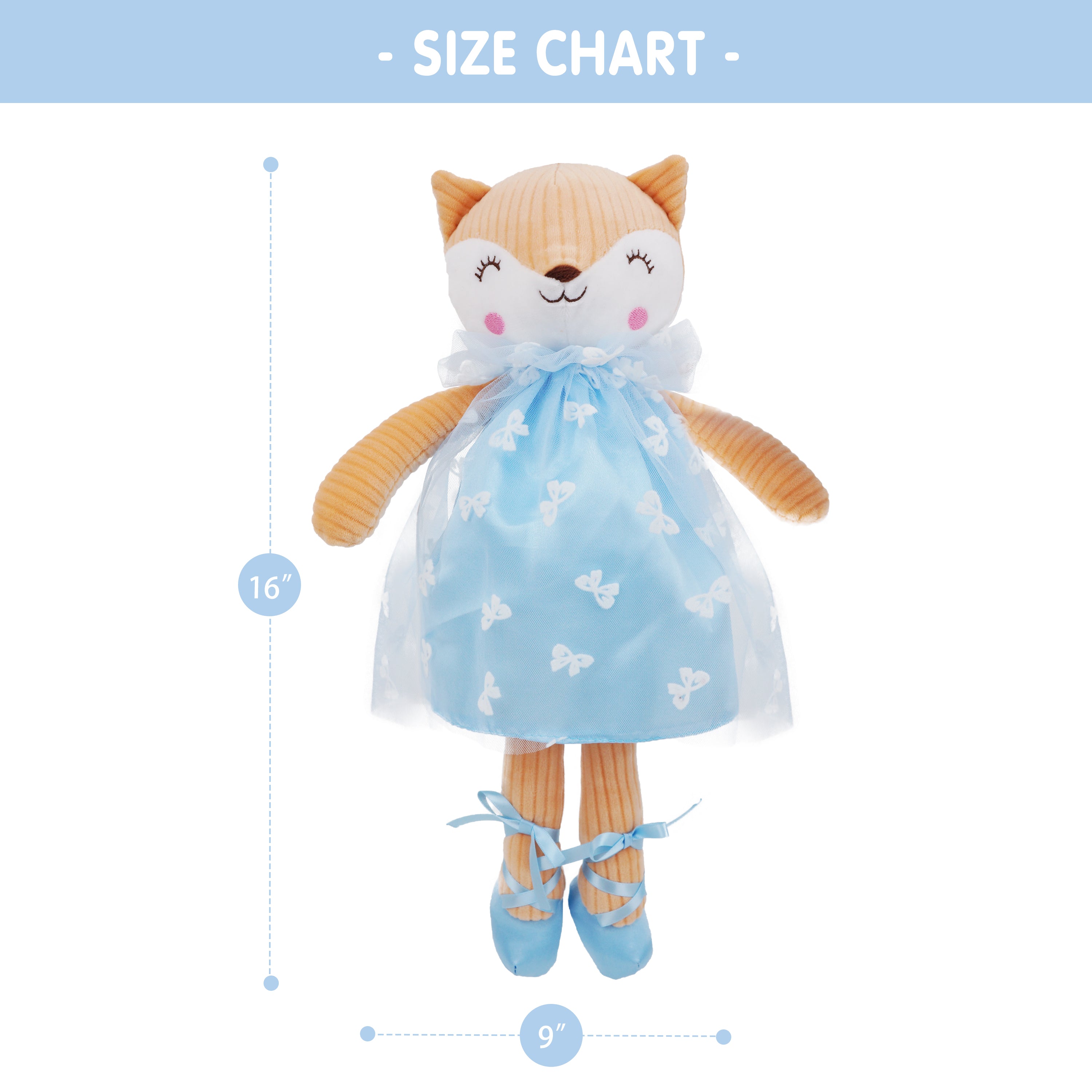 The June Garden 16" Ballerina Fox Stuffed Animal is an enchanting plush toy, perfect for young ballet and fox enthusiasts. Dressed in a blue tulle dress, and featuring adorable embroidered facial details and blue ballerina shoes, this fox stands 16 inches tall and measures 9 inches wide by 4 inches deep—just the right size for toddlers and little girls to cuddle. Crafted from high-quality, soft plush fabric, it ensures durability and a delightful touch. This charming fox makes a wonderful gift for dance recitals, birthdays, or any special occasion, providing hours of safe and imaginative play.