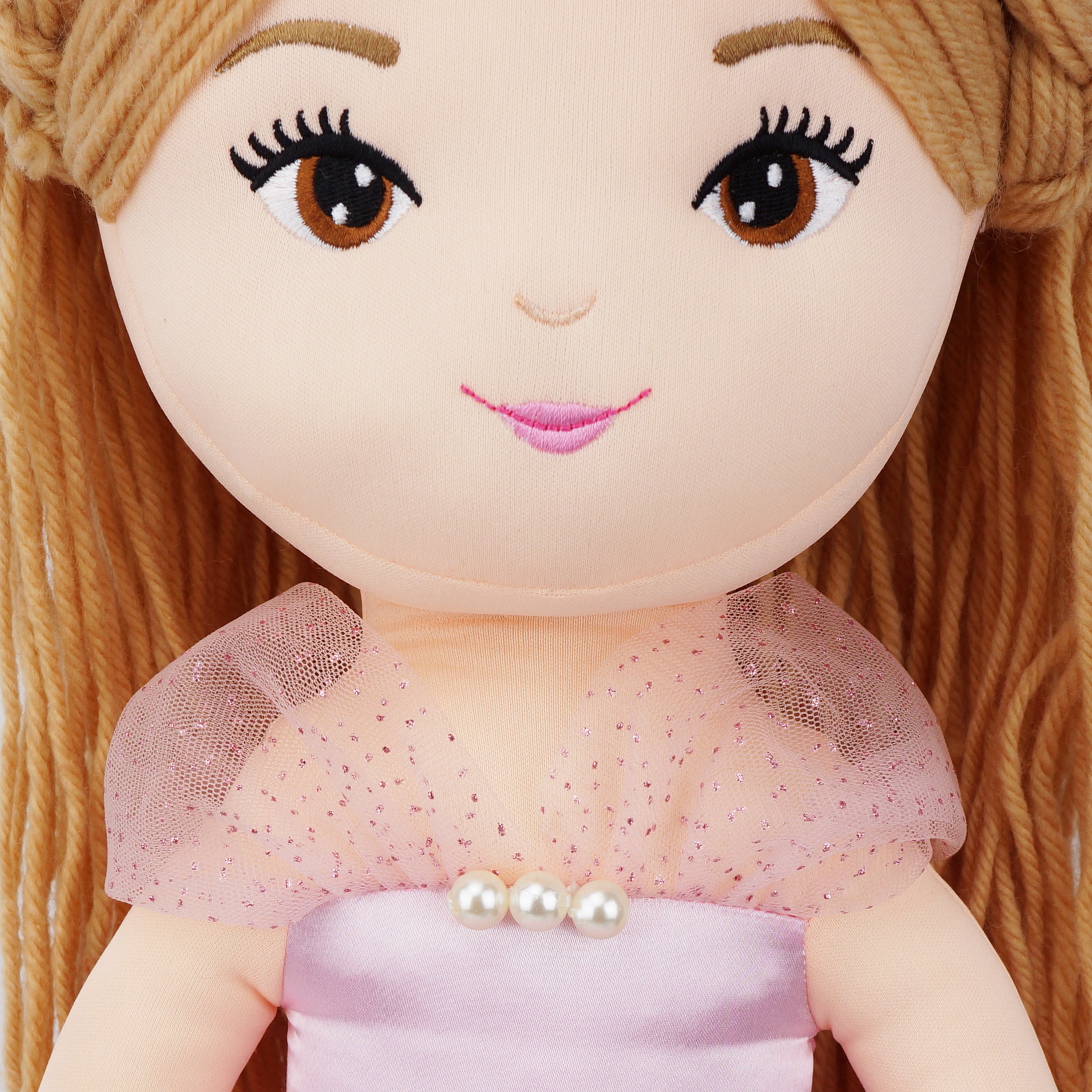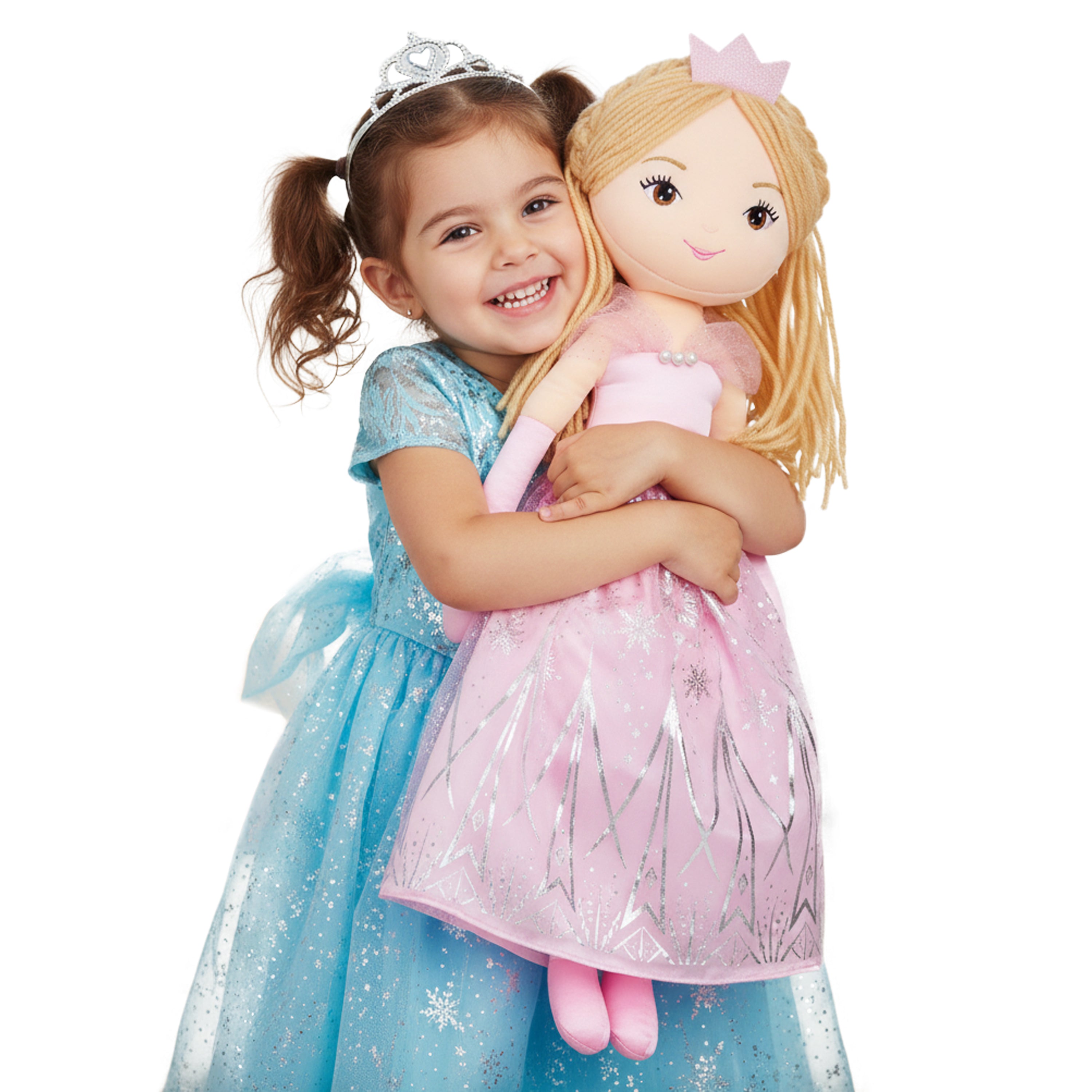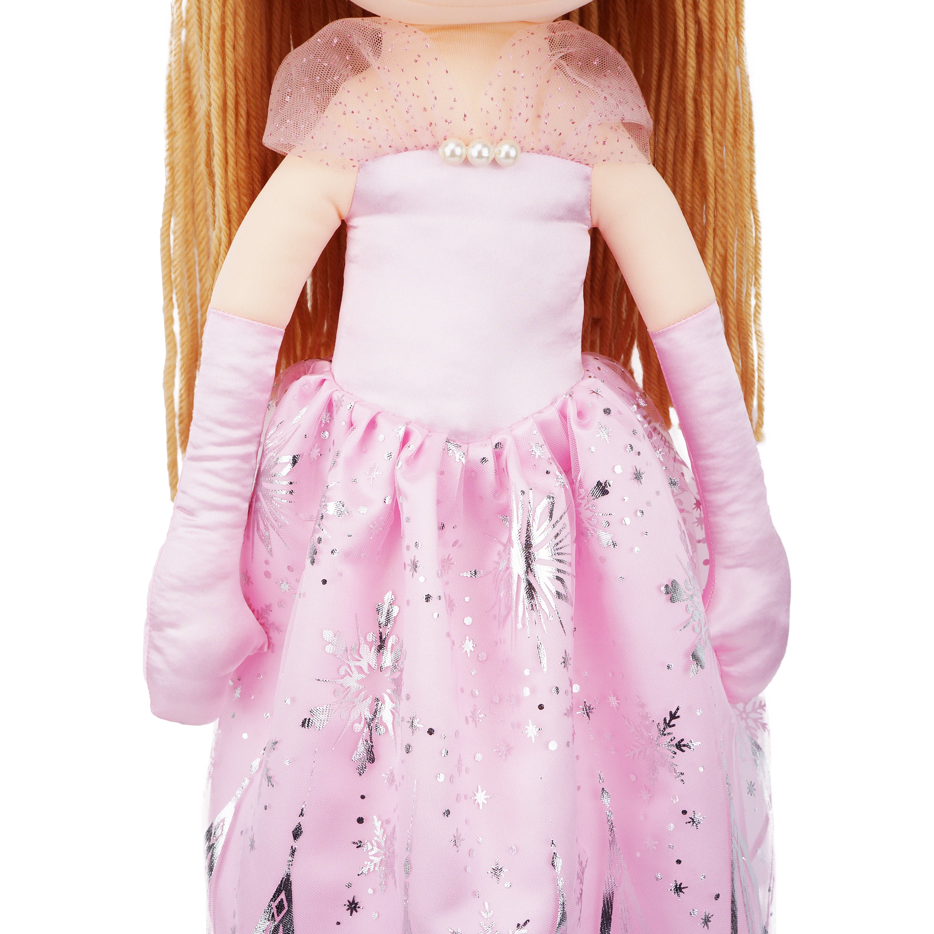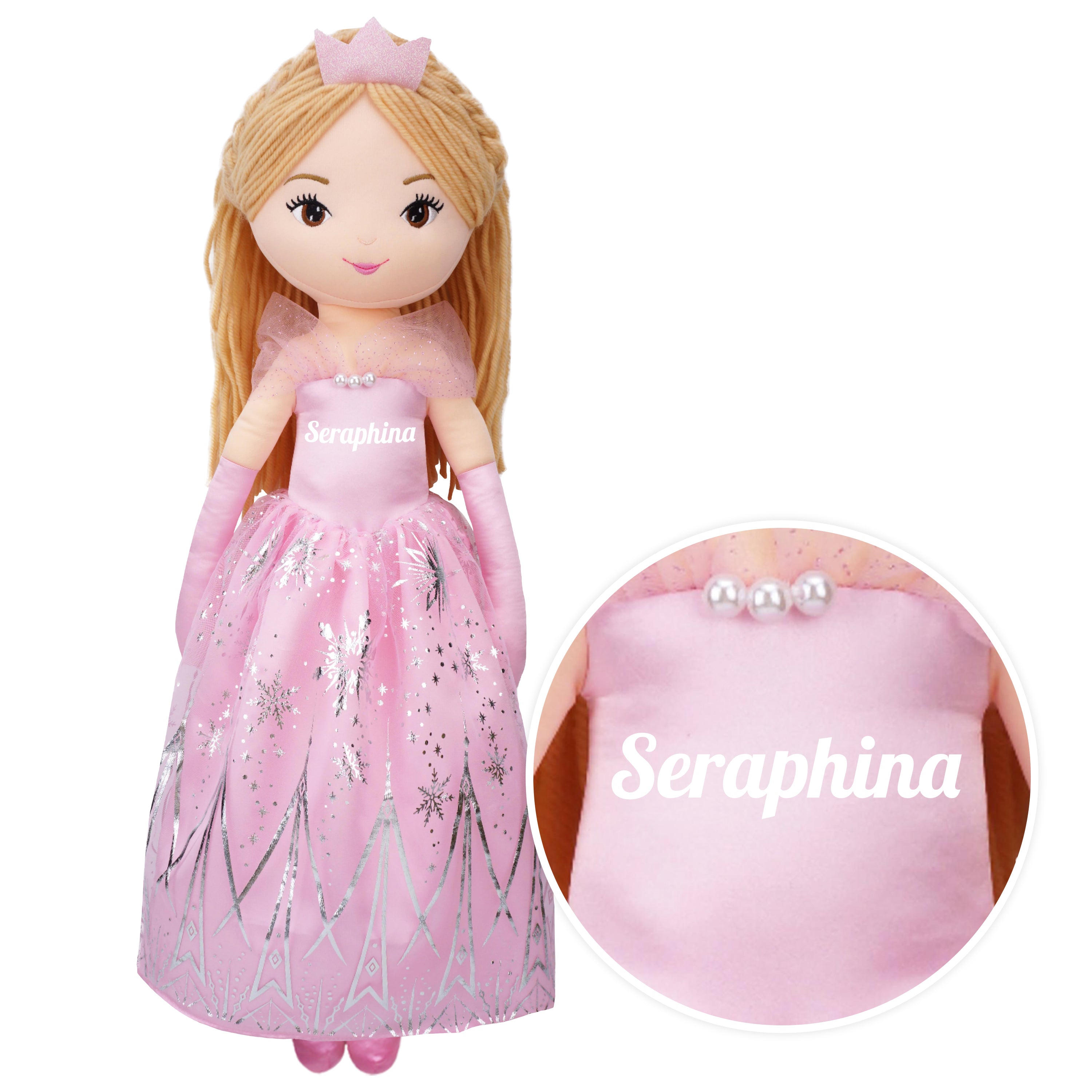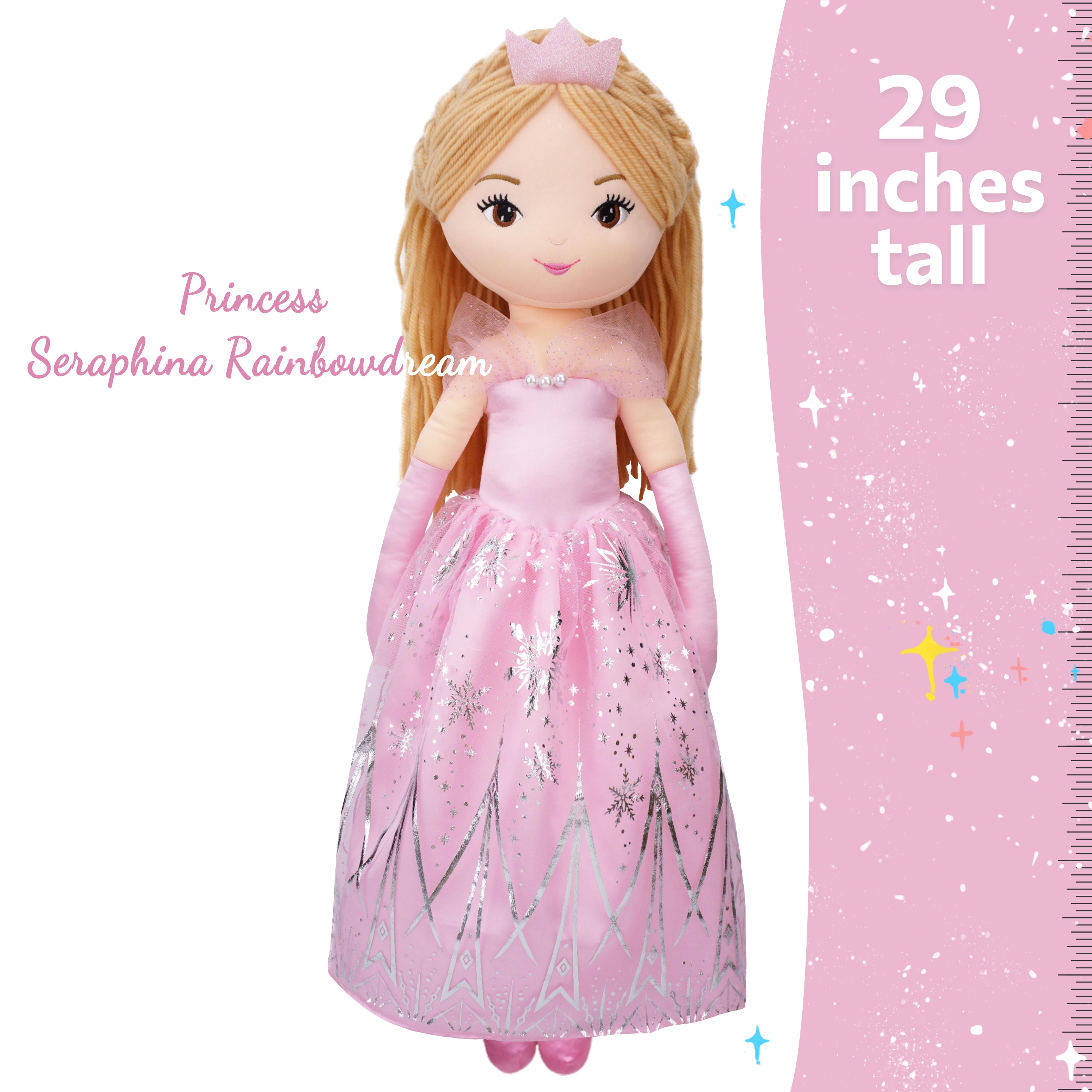 Princess Seraphina plush doll exudes dreamy charm with a soft-hued pink dress adorned with silver snow patterns, sparking imaginations of mystical realms. Standing at 30 inches, she's perfectly crafted for creative storytelling and imaginative play. Her gentle features, with pale brown yarn hair and tender brown eyes, endear her to children, warming their hearts. The doll's shimmery satin dress and delicate details are crafted with care, ensuring beauty in every stitch. Beyond her aesthetic appeal, she's also eco-friendly, made with recycled rPET stuffing, offering a huggable experience that's as gentle on the planet as it is on a child's embrace.